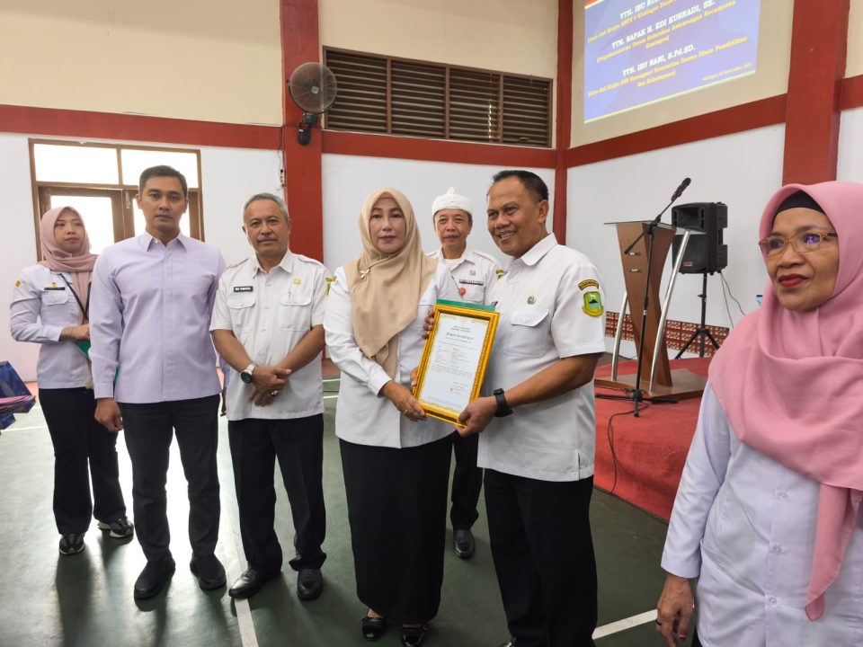 Secara simbolis, Wakil Bupati Kuningan Tuti Andriani menyerahkan SK Pensiun, didampingi Kepala BKPSDM, dan Kacab BJB Kuningan Jonatan.