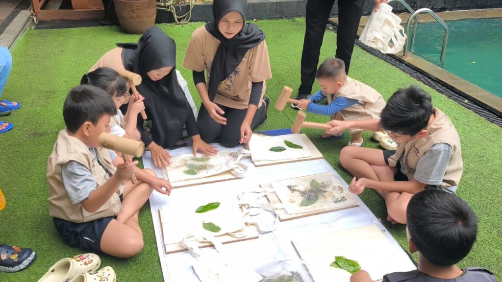 Agenda kedua adalah workshop batik daun atau ecoprint, kegiatan yang langsung menyita perhatian. Di atas alas kayu, panitia menyediakan selembar kain kantung, daun berbagai bentuk, serta palu kayu. Anak-anak diminta menyusun daun di atas kain, lalu memukulnya berulang-ulang hingga motifnya tercetak alami. Suara palu bertalu-talu terdengar seperti ritme permainan. Tawa dan teriakan kecil pun bersahutan setiap kali motif daun muncul jelas di permukaan kain. Kegiatan ini menjadi pengalaman baru bagi banyak peserta, karena membatik biasanya identik dengan malam dan canting, bukan daun dan palu kayu.