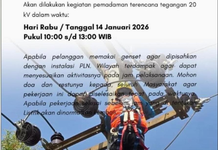 Dalam pemberitahuan resminya, PLN menyebutkan bahwa pekerjaan ini mengharuskan dilakukan pemadaman pada jaringan tegangan menengah 20 kilovolt (KV). Pemadaman dijadwalkan berlangsung selama tiga jam, mulai pukul 10.00 WIB hingga 13.00 WIB. Setelah pekerjaan selesai dan sistem dinyatakan aman, aliran listrik akan dinormalkan kembali.
