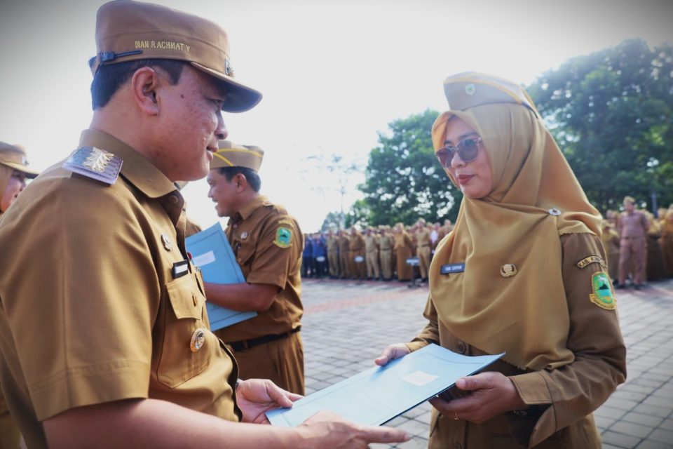 KUNINGAN – Bupati Dian Rachmat Yanuar menyerahkan petikan Surat Keputusan (SK) penugasan dan alih tugas kepala sekolah di lingkungan Dinas Pendidikan dan Kebudayaan Kabupaten Kuningan, Senin (9/3/2026) pagi. Pada kesempatan yang sama, pemerintah daerah juga menyalurkan bantuan stimulan bagi anggota Satuan Perlindungan Masyarakat (Satlinmas) se-Kabupaten Kuningan.
