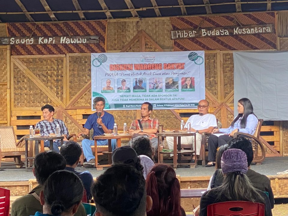 KUNINGAN — Polemik penyadapan getah pohon pinus di kawasan kaki Gunung Ciremai kembali mengemuka dalam Forum Diskusi Waroeng Rakyat yang digelar Selasa, (17/2/2026), di Saung Kopi Hawu, Kabupaten Kuningan. Forum yang menghadirkan akademisi, aktivis lingkungan, dan unsur legislatif itu berlangsung hangat dan interaktif, namun meninggalkan tanda tanya besar yaitu dengan ketidakhadiran pihak Balai Taman Nasional Gunung Ciremai (BTNGC) dan unsur eksekutif pemerintah daerah.