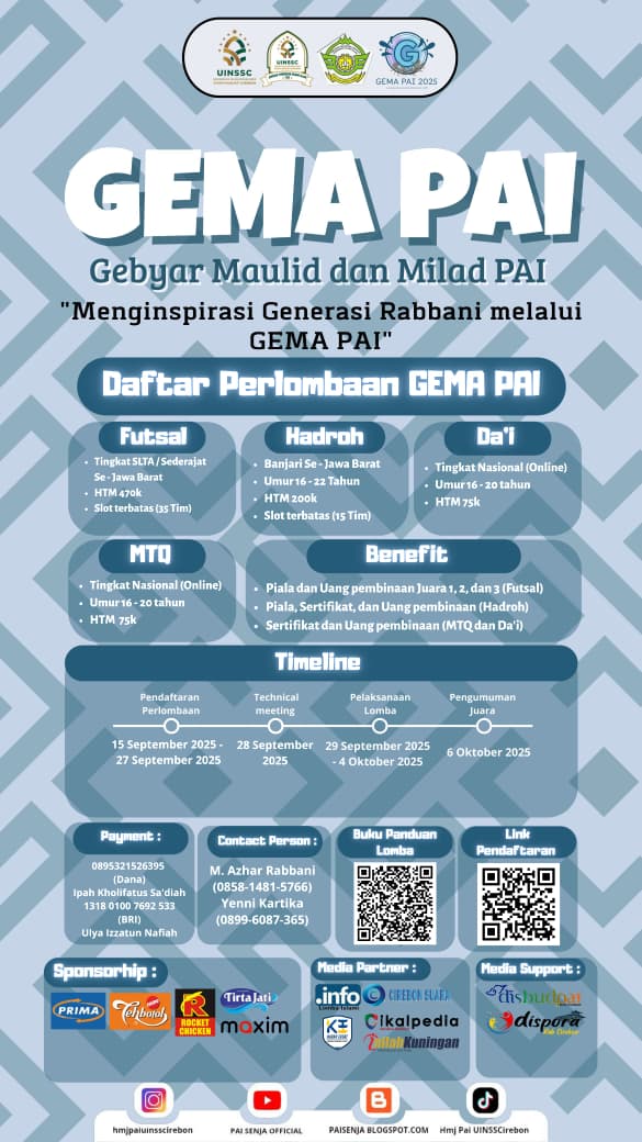 Hilal juga menyampaikan para calon peserta juga dapat mengikuti info di akun media sosial resmi HMJ PAI UIN Siber Syekh Nurjati Cirebon: IG: @hmjpaiuinsscirebon & @gemapai2025_uinssccirebon, YouTube: PAI SENJA OFFICIAL, Tiktok: @hmjpai dan Blogspot: PAISENJA BLOGSPOT.COM.
