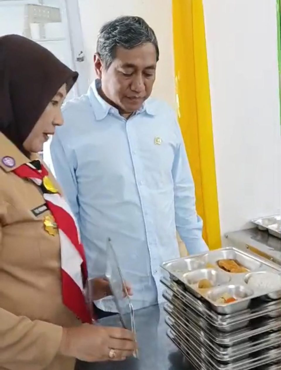 Didampingi Wakil Bupati Kuningan, Tuti Andriani, Rokhmat memeriksa detail seluruh area dapur, mulai dari kebersihan pegawai, ruang memasak, gudang penyimpanan bahan, area pencucian peralatan, hingga proses pengemasan dan distribusi. Menu hari itu nasi putih, nugget ayam, tempe mendoan, tumis wortel putren, dan buah kelengkeng, sempat ia cicipi langsung.
