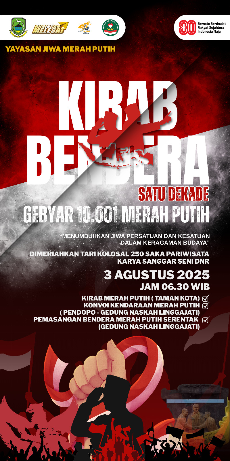 KUNINGAN – Dalam rangka menyambut Hari Ulang Tahun ke-79 Republik Indonesia, Yayasan Jiwa Merah Putih kembali akan menggelar kegiatan tahunan bertajuk GEBYAR10001 MERAH PUTIH, yang kini memasuki edisi ke-10 atau satu dekade pelaksanaan.