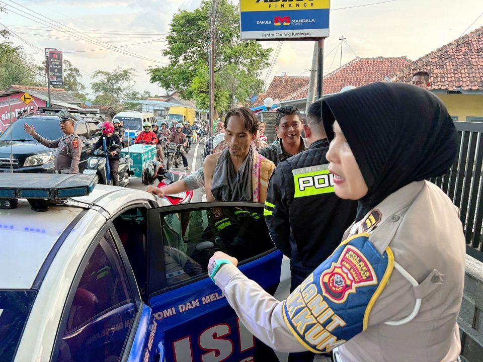 Tidak hanya mengurai kemacetan, tetapi juga mengevakuasi pria yang diduga orang dengan gangguan jiwa (ODGJ) ke RS. Linggarjati Cilimus. Mobil patwal itu terpaksa menjadi angkutan karena menunggu ambulan tidak kunjung tiba.