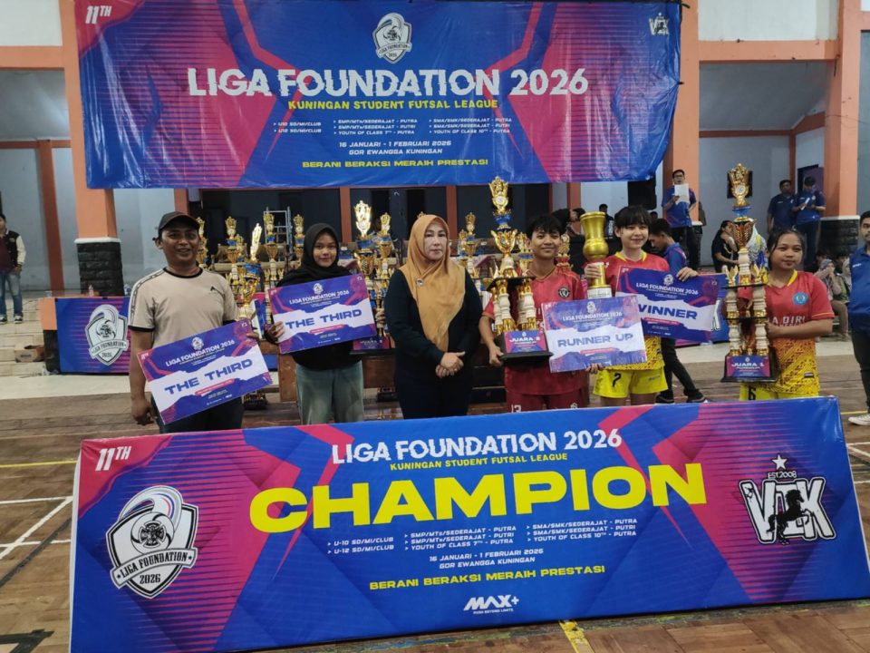 KUNINGAN – Turnamen futsal Liga Fondation 2026 resmi ditutup setelah berlangsung selama beberapa pekan dan diikuti oleh ratusan tim dari berbagai kategori usia dan jenjang sekolah. Penutupan kompetisi tersebut digelar di GOR Ewangga, Kuningan, Selasa, (3/2/2026) malam dan disaksikan oleh ribuan penonton.