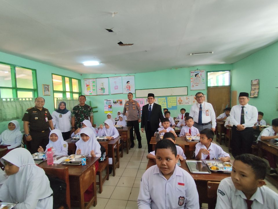 Wajah-wajah ceria anak-anak SDN 1 Ciporang terlihat saat menerima paket makan siang bergizi. Menunya sederhana namun sehat: oseng buncis wortel, telur pindang, jeruk, dan susu kotak.