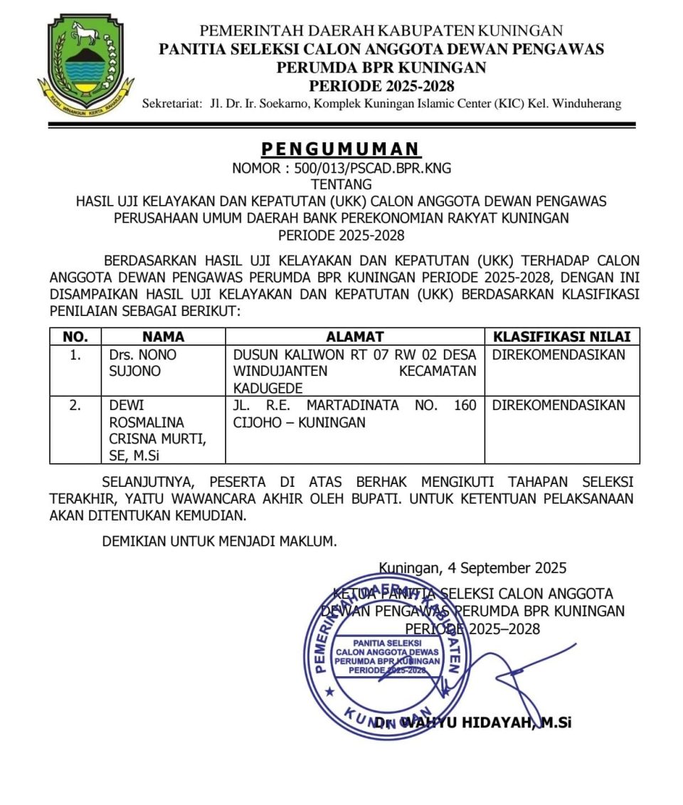 KUNINGAN – Panitia Seleksi Calon Anggota Dewan Pengawas Perumda BPR Kuningan periode 2025–2028 mengumumkan hasil uji kelayakan dan kepatutan (UKK), Kamis, (4/9/2025). Dari sejumlah peserta, dua orang dinyatakan lulus dengan klasifikasi penilaian “direkomendasikan”.