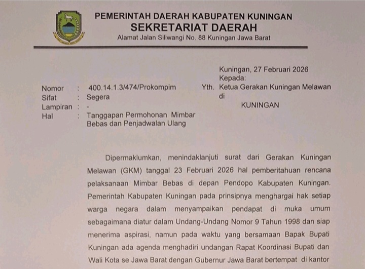 KUNINGAN – Aksi demonstrasi yang akan digelar oleh Gerakan Kuningan Melawan (GKM) diundur. Penundaan tersebut diumumkan melalui surat yang diterbitkan oleh Sekretariat Daerah yang ditandatangani oleh Kabag Protokol dan Komunikasi Pimpinan (Prokopim) Kabupaten Kuningan.